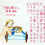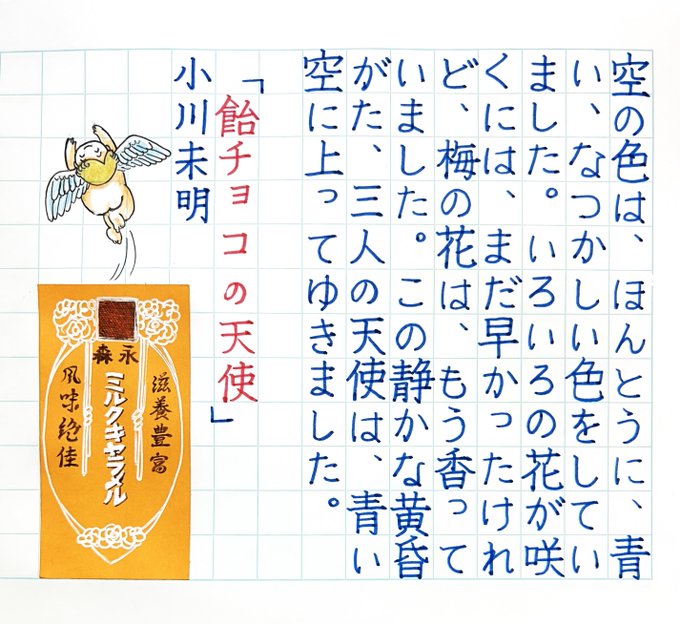 お題をありがとうございます。 #空想書写 No. 377 小川未明 「飴チョコの天使」より 飴チョコとは、キャラメルのことです。 主人公は森永ミルクキャラメルの箱に描かれている天使。 食べてもらって箱が捨てられると昇天できるようです。 #書写好きな人と繋がりたい #絵描きさんと繋がりたい twitter.com/img_shosha/s…