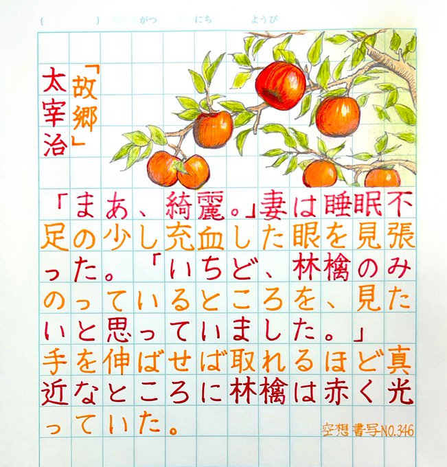 お題をありがとうございます。 No. 346 太宰治「故郷」 #空想書写 枝にたわわになっててたわむんさ。 なっからいっぺえなるんさね。 #書写好きな人と繋がりたい #絵描きさんと繋がりたい #30分ドローイング ※うちの故郷の言葉じゃて。 twitter.com/img_shosha/s…