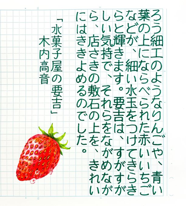お題をありがとうございます。 #空想書写 No. 353 木内高音 「水菓子屋の要吉」より りんごは先週のお題で描いたばかりなので 今日の挿絵はいちごです。 色鉛筆と少しペンで模写しています。 #書写好きな人と繋がりたい #絵描きさんと繋がりたい #45分間ドローイング twitter.com/img_shosha/s…