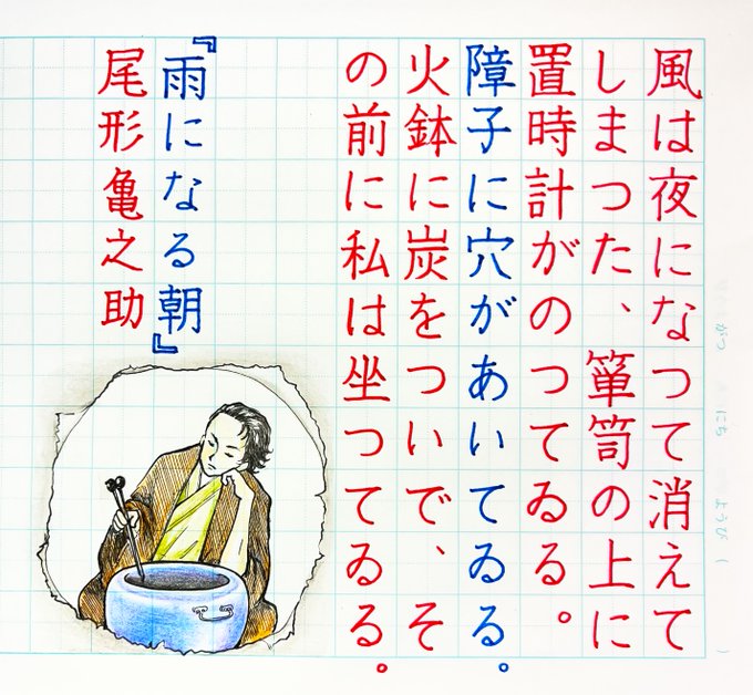 お題をありがとうございます。 #空想書写 No. 354 尾形亀之助 「雨になる朝」より 作者の日記のような作品でした。 写真が随分とお若いと思ったら41才で没してました。 挿絵は障子にあいた穴からの風景です。 #書写好きな人と繋がりたい #絵描きさんと繋がりたい twitter.com/img_shosha/s…