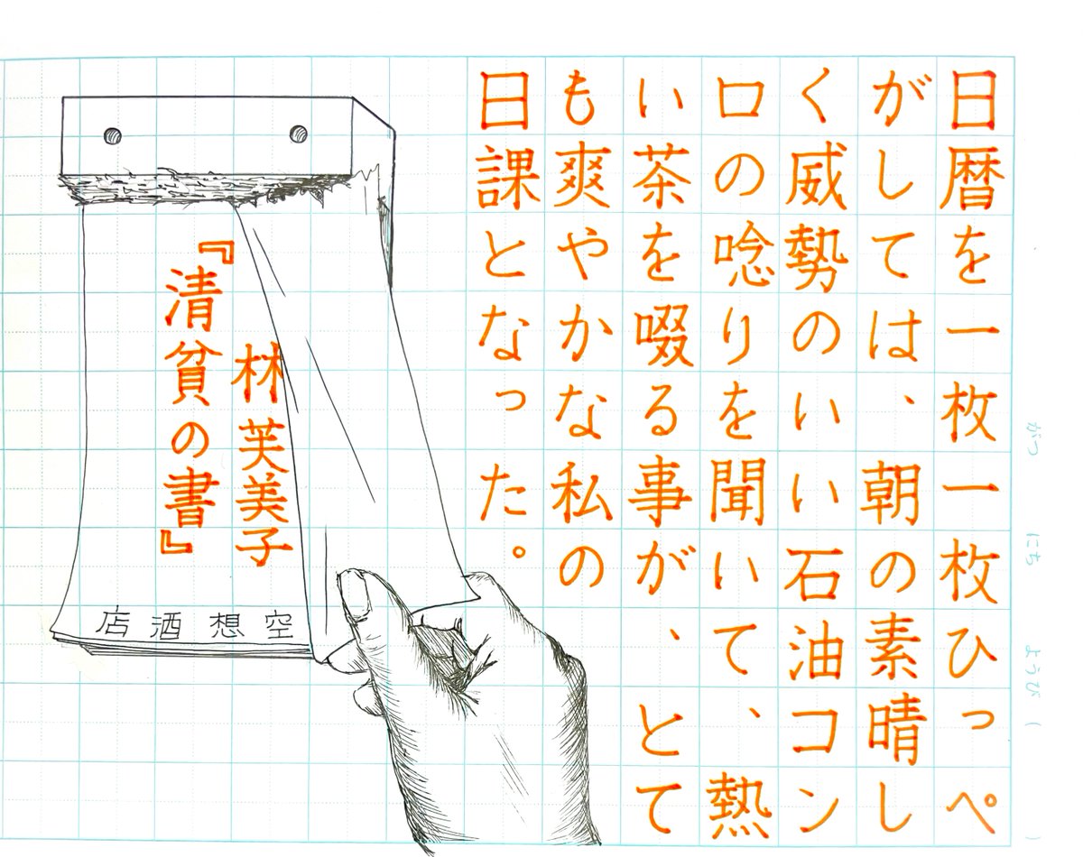 お題をありがとうございます #空想書写 No. 356 林芙美子 「清貧の書」より 日めくりカレンダーをめくることが一日の始まりになっているんですね 私の朝の始まりは朝活書写! ではなく、その挿絵を描くための原文の読書から始まります(*_*) #書写好きな人と繋がりたい #絵描きさんと繋がりたい twitter.com/img_shosha/s…