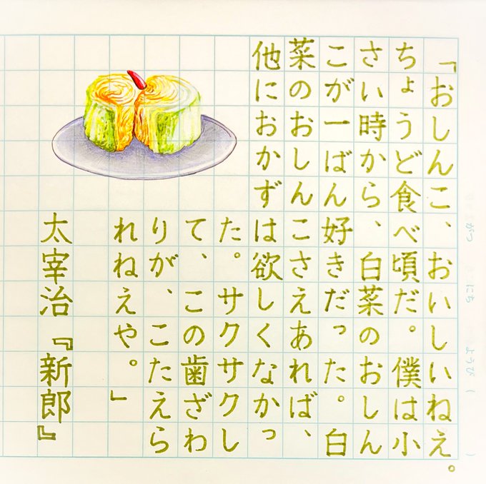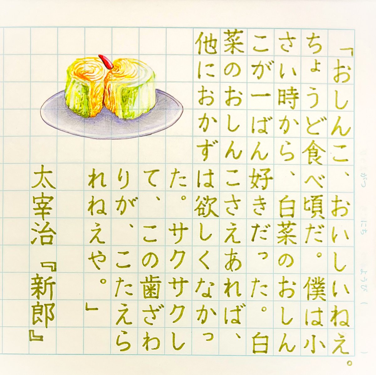 お題をありがとうございます。 #空想書写 太宰治「新郎」より 我が家では母が白菜を樽で漬けてくれます。 なくなる前に次の樽に漬け込むので常時、戴けます。 ありがたや。 塩、柚子、昆布、鷹の爪、あとにんにくを入れるのがポイント。 #書写好きな人と繋がりたい #絵描きさんと繋がりたい twitter.com/img_shosha/s…