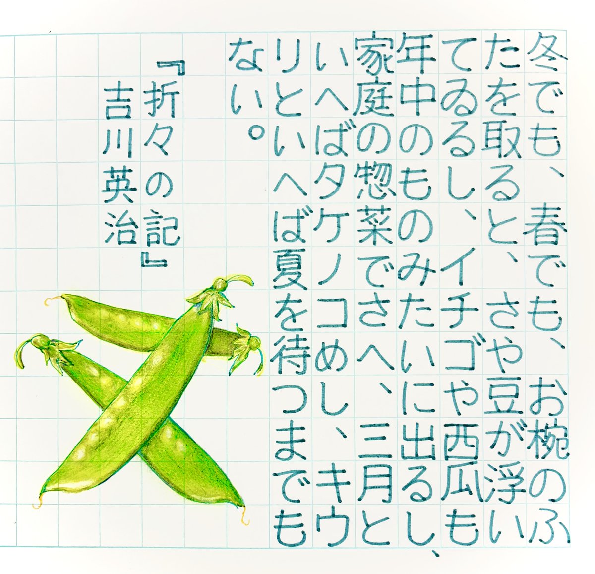 お題をありがとうございます。 #空想書写 No. 361 吉川英治 「折々の記」より 今日の挿絵はさや豆(さやえんどう) これが成長するとグリーンピースになります。 #書写好きな人と繋がりたい #絵描きさんと繋がりたい 注⚠️比較画像(写真)を添付する行為はおやめください twitter.com/img_shosha/s…