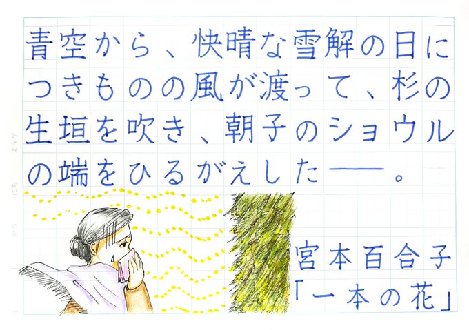 お題をありがとうございます #空想書写 No. 376 宮本百合子「一本の花」 2月下旬の午後 季節外れの暖かな風が吹くという情景です。 ですが「杉の生垣」というワードにより、花粉症の私のイメージはこんな感じになりました。 ごめんね百合子 #書写好きな人と繋がりたい #絵描きさんと繋がりたい twitter.com/img_shosha/s…
