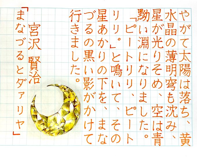 お題をありがとうございます。 #空想書写 No. 366 宮沢賢治 「まなづるとダァリヤ」より 挿絵は、黄水晶の薄明穹(三日月)です。 丸くカットされている黄水晶の画像を参考に、脳内で三日月型にカットしました。 #書写好きな人と繋がりたい #絵描きさんと繋がりたい twitter.com/img_shosha/s…