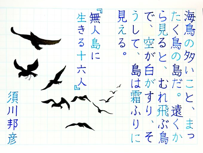 お題をありがとうございます。 #空想書写 No. 368 「無人島に生きる十六人」より 海鳥、好きです。 カモメもウミネコも。 群馬にも飛来しないかな・・・。 #書写好きな人と繋がりたい #絵描きさんと繋がりたい #群馬県民 twitter.com/img_shosha/s…
