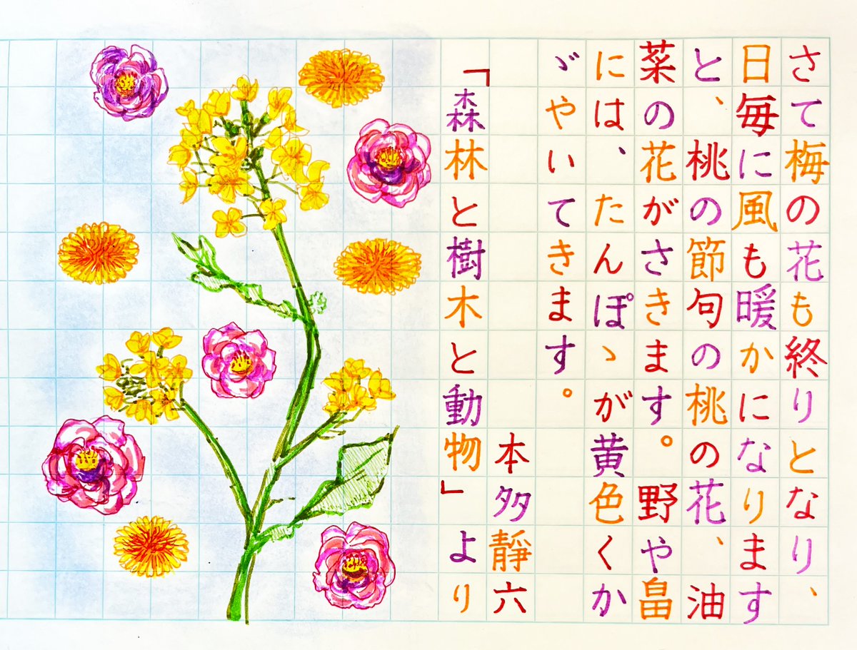 お題をありがとうございます。 #空想書写 No. 369 本多靜六 「森林と樹木と動物」より 春めいてきました。 もうずっと花を描いていたい。 そんな気分。 #書写好きな人と繋がりたい #絵描きさんと繋がりたい twitter.com/img_shosha/s…