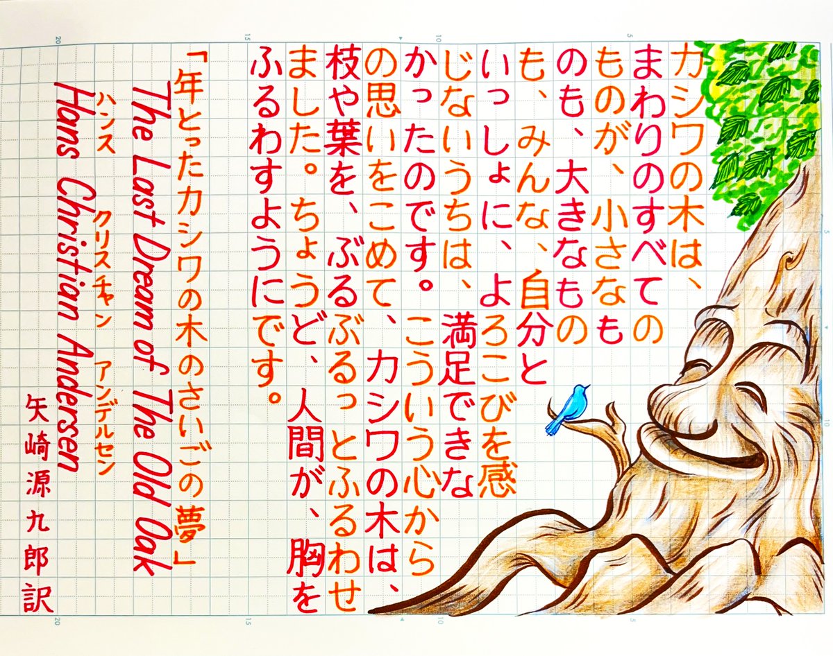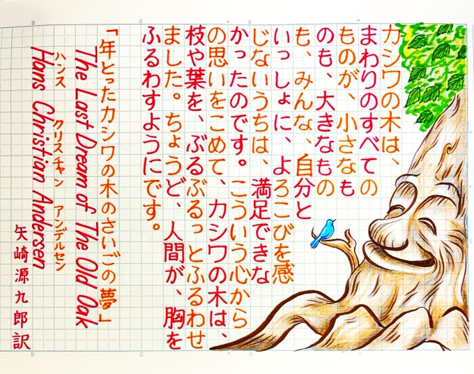 素敵なお題をありがとうございます。 #洋書de書写 第249回 『年とったカシワの木のさいごの夢』 アンデルセン(デンマーク🇩🇰) 木が最後に見た夢は慈愛に満ちたものでした。 理想的な去り方ですね。 私も眠りながら逝きたいです。 #書写好きな人と繋がりたい #絵描きさんと繋がりたい twitter.com/yousho_shosh…