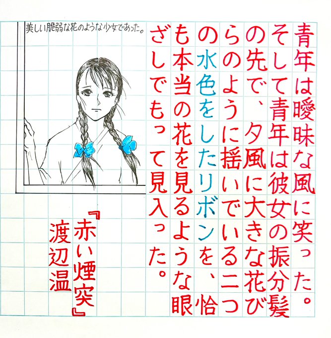 お題をありがとうございます。 #空想書写 No. 371 渡辺温 「赤い煙突」より 挿絵は、隣家の赤い煙突を眺めている少女。 病弱な美少女がいつも自分ちを眺めてたら惚れてまうやろ、ふつう。 #書写好きな人と繋がりたい #絵描きさんと繋がりたい twitter.com/img_shosha/s…