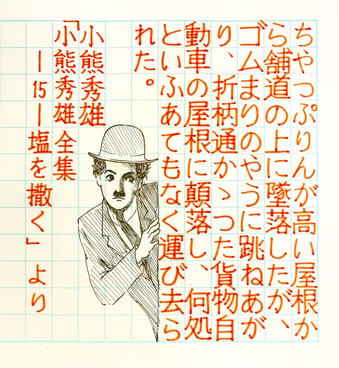 お題をありがとうございます。 #空想書写 No. 374 小熊秀雄 「小熊秀雄全集-15-塩を撒く」 娯楽の多い現在においても、チャップリンの映画は面白いですね! 画像検索ついでにYouTubeをチェックしたら、ついつい見入ってしまいました。 #書写好きな人と繋がりたい #絵描きさんと繋がりたい twitter.com/img_shosha/s…