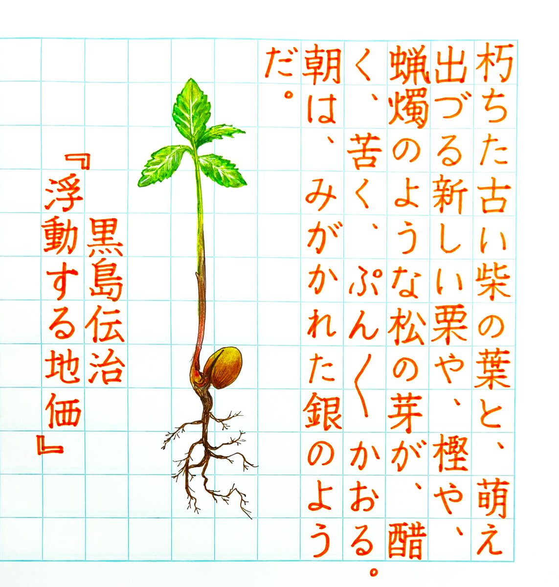 お題をありがとうございます。 #空想書写 No. 379 黒島伝治 「浮動する地価」より 今日の挿絵は、樫の幼木。 自然と発芽して根付く確率を考えると途方もありません。 選ばれしエリートどんぐりですね。 #書写好きな人と繋がりたい #絵描きさんと繋がりたい twitter.com/img_shosha/s…
