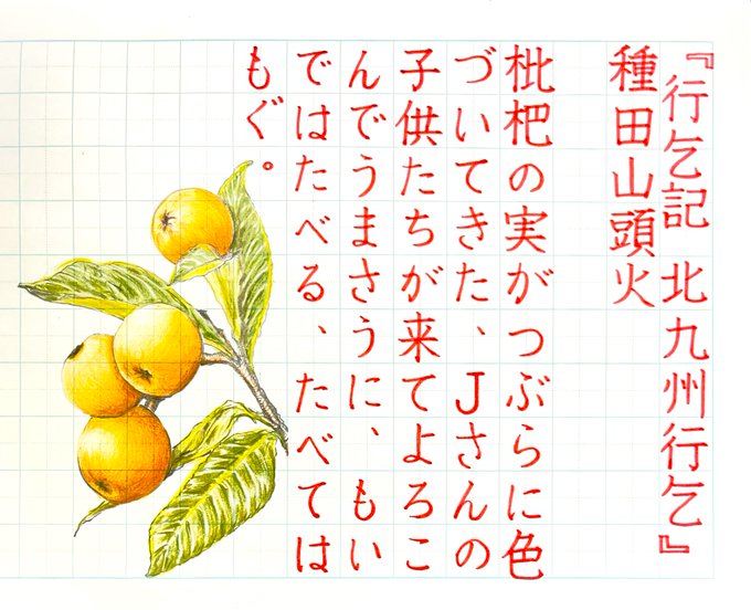 お題をありがとうございます #空想書写 No. 474 種田山頭火「行乞記 北九州行乞」 今日の挿絵はビワです 美味しいよね、大好き #絵描きさんと繋がりたい #書写好きな人と繋がりたい #アナログ絵 #色鉛筆画 twitter.com/img_shosha/sta…