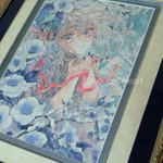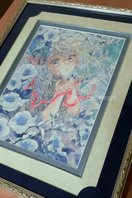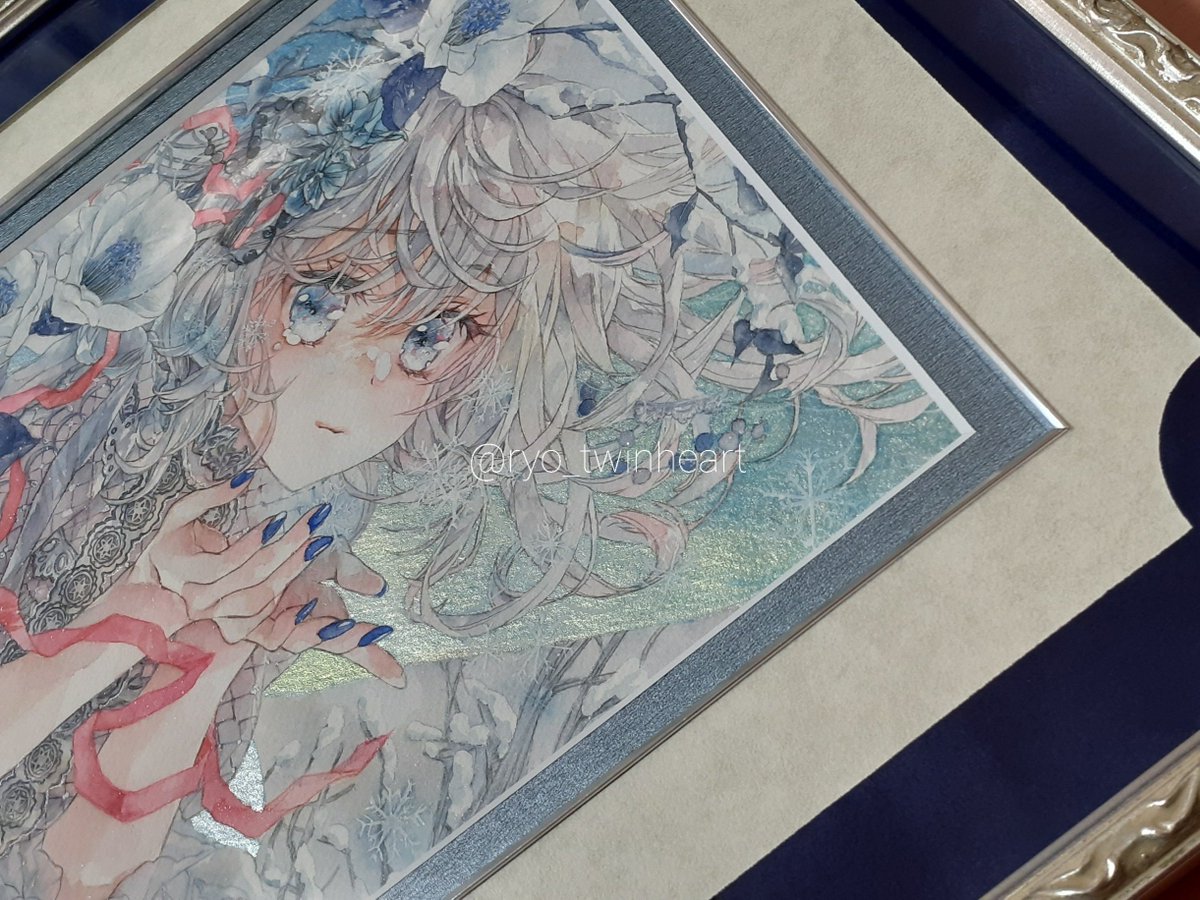 2月23日より開催「 #最後の雪花 」展のメインビジュアルを青葉画荘さん(@aobagasou)のおまかせ額装でお願いしました❄️ 今回もテーマや作品に親身になって寄り添ってくださりありがとうございました 銀フレーム、ブルーパールと紺スエードのマットなど…コントラストがとても素敵な装いで感激です twitter.com/art_cocoon/sta…