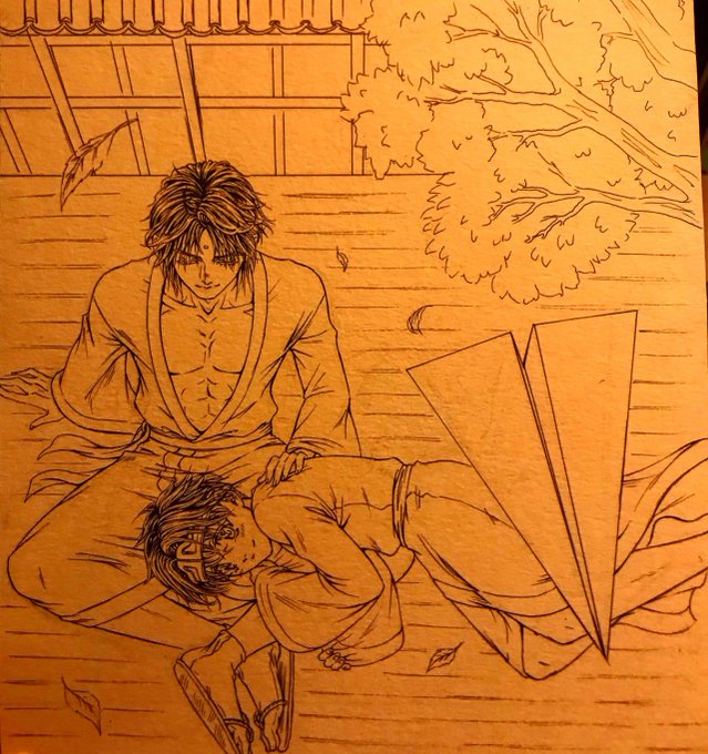 Sanzo and Goku flying an orange paper airplane through the autumn sky~ 🍂🍁#SaiyukiZEROIN #saiyuki #最遊記ZEROIN #最遊記 #art #watercolor #painting #illustration #イラスト #anime #AnimeArt