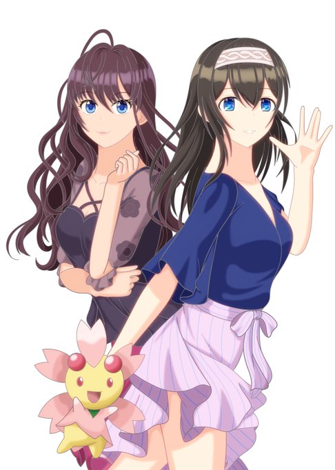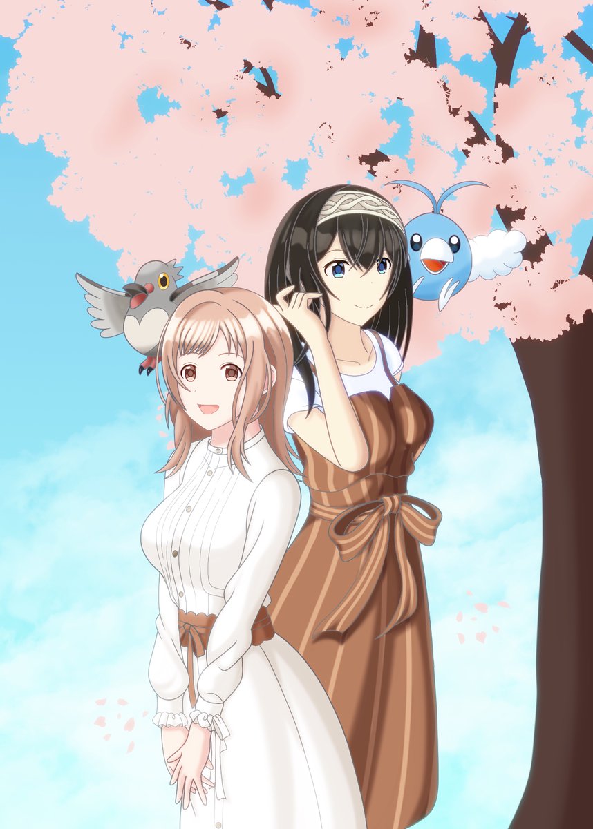 今月の月刊文香になります 今回、シンステ11にてのアさんが志希さんの素敵なコスで売り子さんをして頂いたので描きました また桜の時期なので少しでも雰囲気が伝わるポケモンも一緒に描いています 鷺沢文香さん、一ノ瀬志希さん、チェリム #月刊文香 #cin_stage