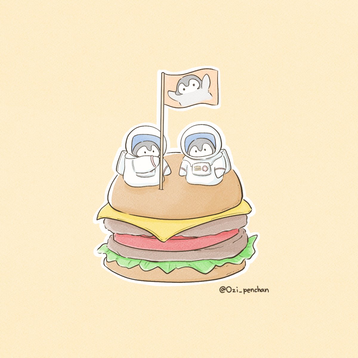 「月面着陸の日」と「ハンバーガーの日」に同時で便乗するデビ!(`・ω・´)✨ #月面着陸の日 #ハンバーガーの日 #イラスト #キャラクター #LINEスタンプ #ネコ #絵描きさんと繫がりたい #hamburger #illustration #character #cat #kawaii #followme