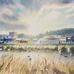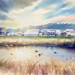 元旦の朝。 新作。 F4号くらいのアルシュ紙。 #透明水彩 #水彩画 #風景画 #watercolor #Watercolour #watercolorpainting #朝日 #landscape