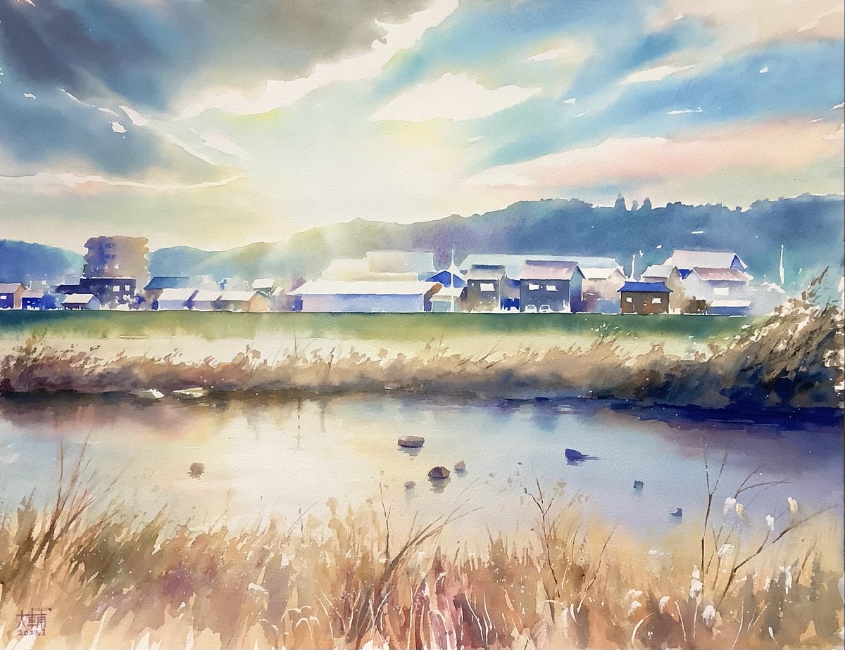 真冬の朝日。 新作。 F6号ウォーターフォード紙。 #透明水彩 #水彩画 #風景画 #watercolor #Watercolour #watercolorpainting #landscape #朝日