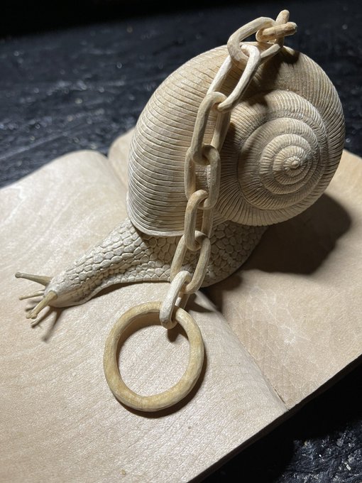 鎖とカタツムリ🐌 鎖は昔から考えていて 今日初めて作ったんですが、 頭であれこれ考えるより手を動かした方が簡単でした。 #鎖 #カタツムリ #木彫 #シナ材 #小島秋彦 #chain #snail #woodsculpture #chineselumber #akihikokojima