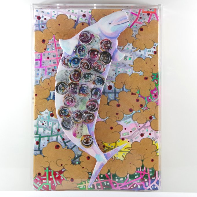 TOKYO MONSTER 「GoTo極楽_7」 アクリル絵具、東京の地図、真鍮箔、海岸のプラスチック片、ペン、インクジェットプリント、カンバス F3 2022 #現代アート #contemporaryart #art #marineplastic #海洋プラスチック #芸術の輪 #みんなで楽しむTwitter展示会 #artilljp #木白牧