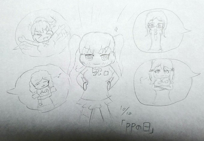 #inktober2020 10日目(10/10) お題『#10月10日はPPの日』 のほほんお嬢様・桃川紗々 瞬足スプリンター・栗本遥 揺るぎない絶対的自信・杏橋天音 頭脳明晰ゲーマー・李野田真乃 家事のプロフェッショナル・棗いつみ みな個性様々だが、チーム力は抜群だ!