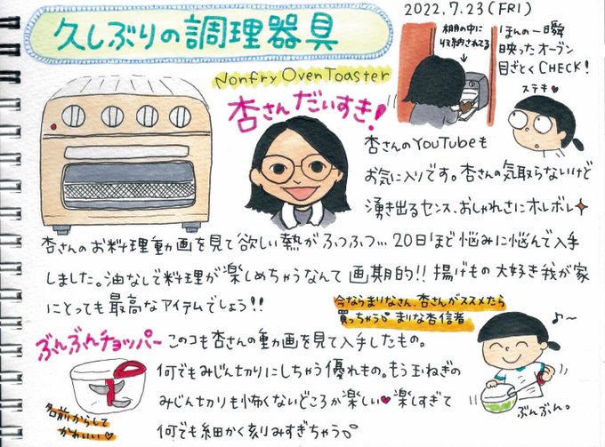 久しぶりに普通?の絵日記。 というのも久しぶりに調理器具を入手しました。 ノンフライオーブン!! 可愛い子なので見える場所に設置。 #絵日記 #ノンフライオーブン #クイジナートノンフライオーブントースター #cuisinart #キッチン #キッチン収納 #イラスト #ぶんぶんチョッパー #杏 さん大好き