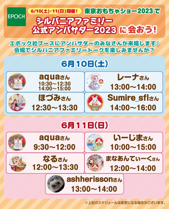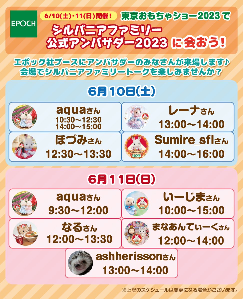 #東京おもちゃショー2023 で #シルバニア公式アンバサダー に会おう✨ 会場で #シルバニアファミリー トークを楽しみませんか? 6/10(土)・11(日) 東京ビッグサイトにて開催🎉 ぜひエポック社ブース(西1ホール 1-07)へ遊びにきてね🎵 入場券発売中→toys.or.jp/toyshow/ (小学生以下は入場無料)