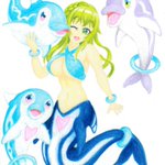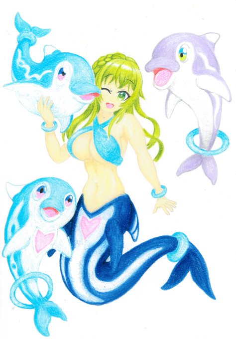 【シオリ(海の日記念絵)】 海の日を記念して人魚姫シオリを描きました! 『ポケットモンスター スカーレット&バイオレット』のイルカマンをイメージしたイルカの人魚姫です。 ナミイルカとイルカマンもご一緒に。 #海の日 #東京ドールズ #東京ドールズファンアート #東京ドールズ23年度水着