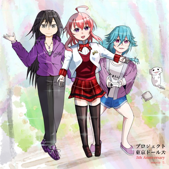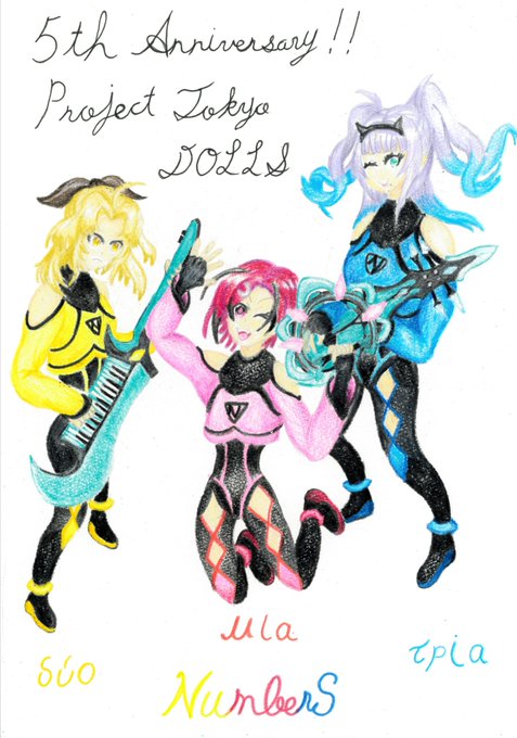 【祝・プロジェクト東京ドールズ5周年!】 ミア「5周年おめでとう!」 ディオ「…おめでとう」 トリア「Herzlichen Glückwunsch!!」 プロジェクト東京ドールズは終らない、私たちが終わらせないから………!! #東京ドールズ #東京ドールズ5周年 #東京ドールズforever #東京ドールズファンアート