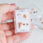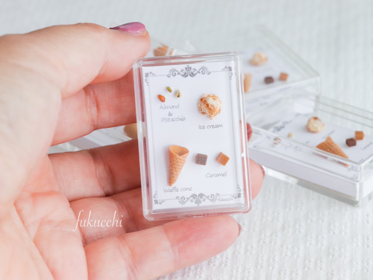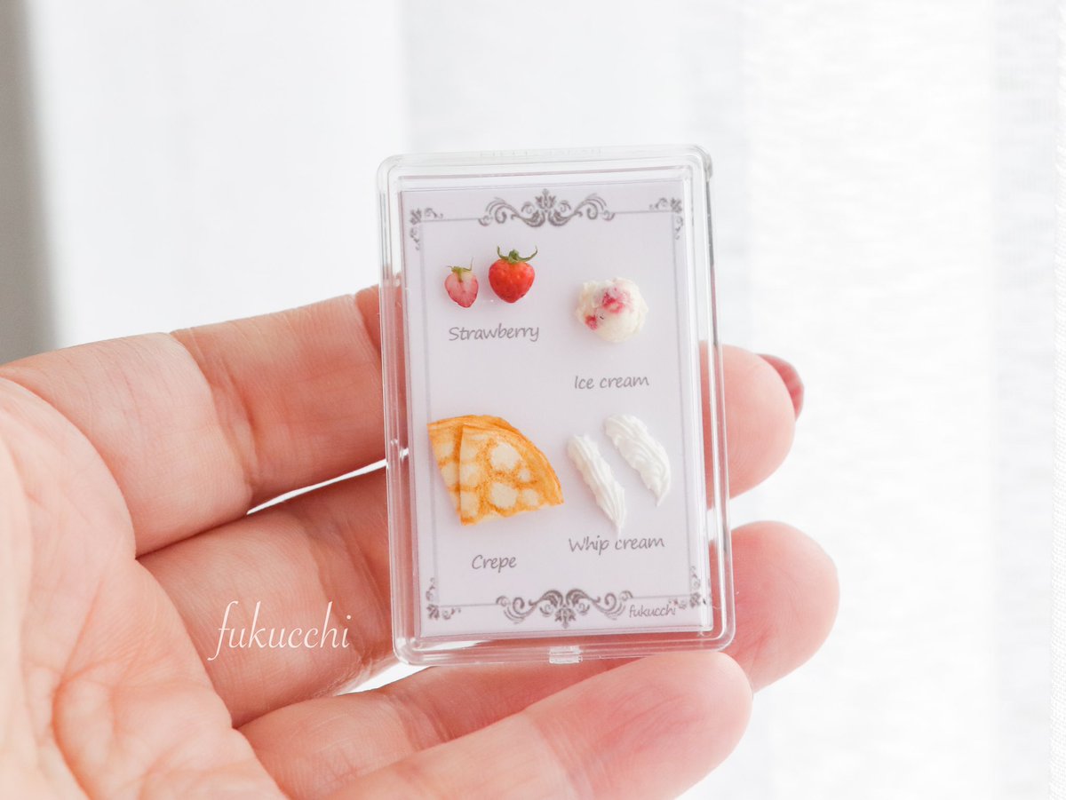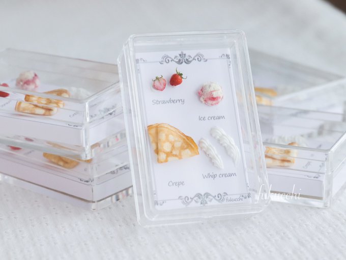 苺のクレープとキャラメルアイス それぞれパーツを並べてみました。 7/9.10 #東京ドールハウスミニチュアショウ ( @dollshouse_jp )にて販売予定です。 ※仮止め剤で固定