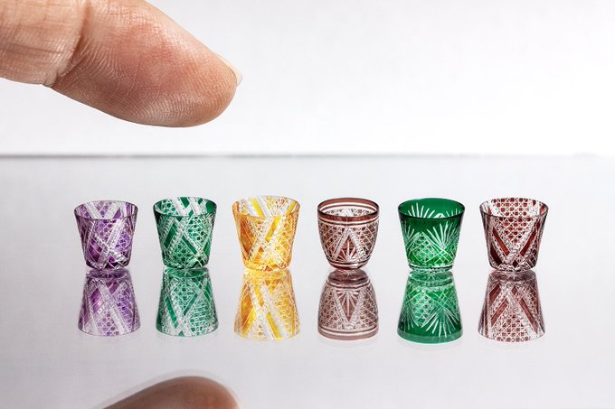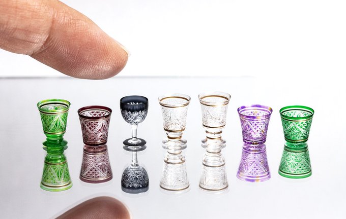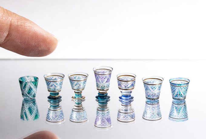 今週末の #東京ドールハウスミニチュアショウ で販売する作品の一部です こちらは青や紫、水色で着色した涼しげなカラーのグラスシリーズです 紫陽花をイメージした作品もあります #ミニチュア