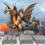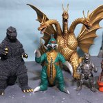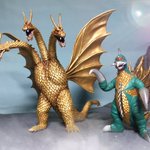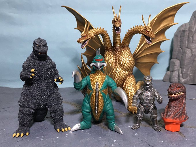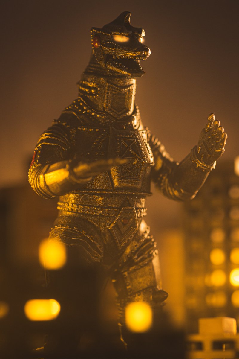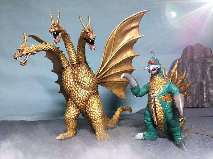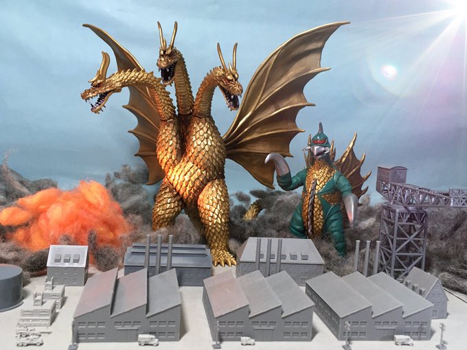 #夜のフィギュア撮影会 お題『フリー』 1/700スケールのキングギドラとガイガン!工場地帯を強襲する凶悪コンビ! ← 設定身長だとこんなにサイズ差があるのだ😄 #東宝怪獣コレクション #キングギドラ #ガイガン #ゴジラ #Godzilla #デアゴスティーニ #DeAGOSTINI #ピットロード #オモ写