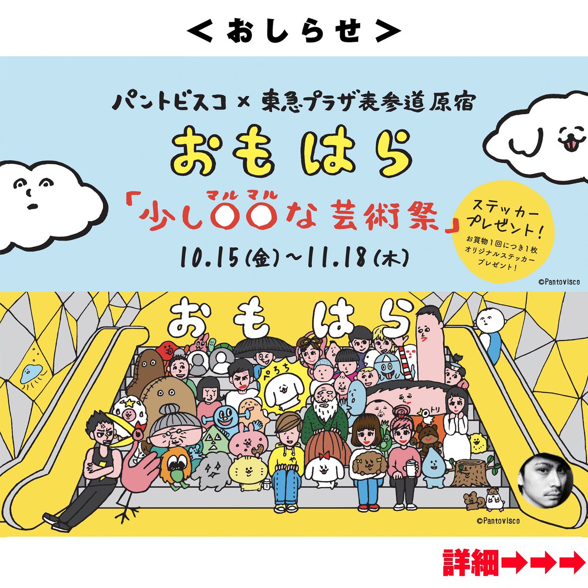 「少し○○な芸術祭」開催決定! 嬉しいお知らせです。私パントビスコの久々の展示が東急プラザ表参道原宿にて開催されます。ぜひお越しください。パントビスコ 期間:2021年10月15日(金)~11月18日(木) #東急プラザ表参道原宿 #パントビスコ #少しマルマルな芸術祭 #すこマル
