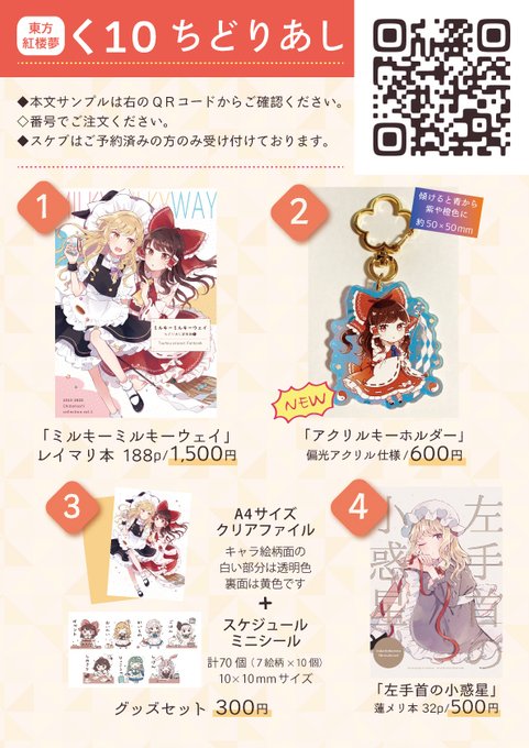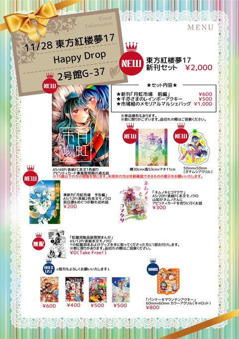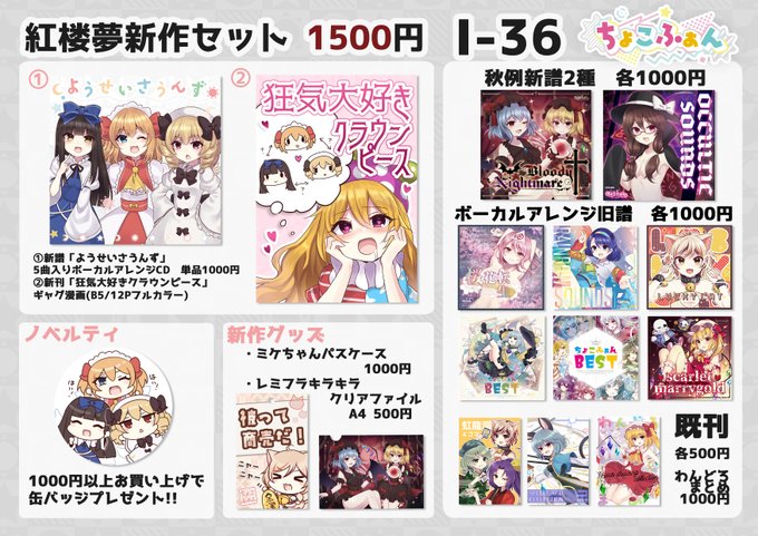 【 #東方紅楼夢17 おしながき 】 スペース→I-36「ちょこふぁん」🍫🌟 新譜はつよつよ妖精大戦争ボーカルアレンジCD🎧 試聴→youtu.be/-BqxXfsAB 新刊はなんでも許せる人向けのギャグ漫画🔥 既刊、旧譜、ノベルティもあります! BOOTH新作セット通販🐪→ subachoco.booth.pm/items/3456586