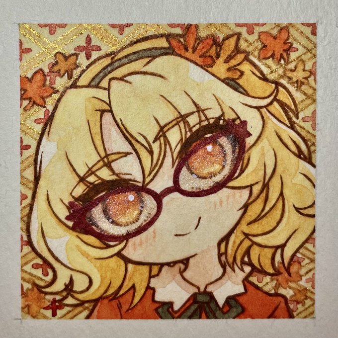 秋静葉様のメガネ姿の🍁👓ミニ原画できた!10年ぶりぐらいに描いたけど素敵に描けたと思う(๑ᵒ ᗜ ᵒ)و ̑✧ ちょい最近和柄マイブームなので、背景も金屏風ぽいかんじ? メガネも地味に🍁イメージ✨ #ほまネキ入院記録 #東方Project #秋静葉 #東方風神録 #透明水彩 #アナログイラスト #Watercolor