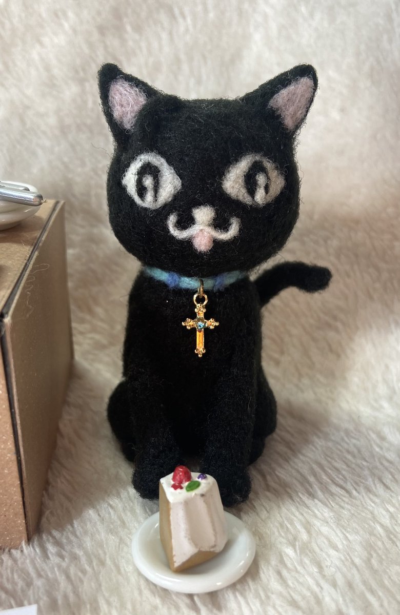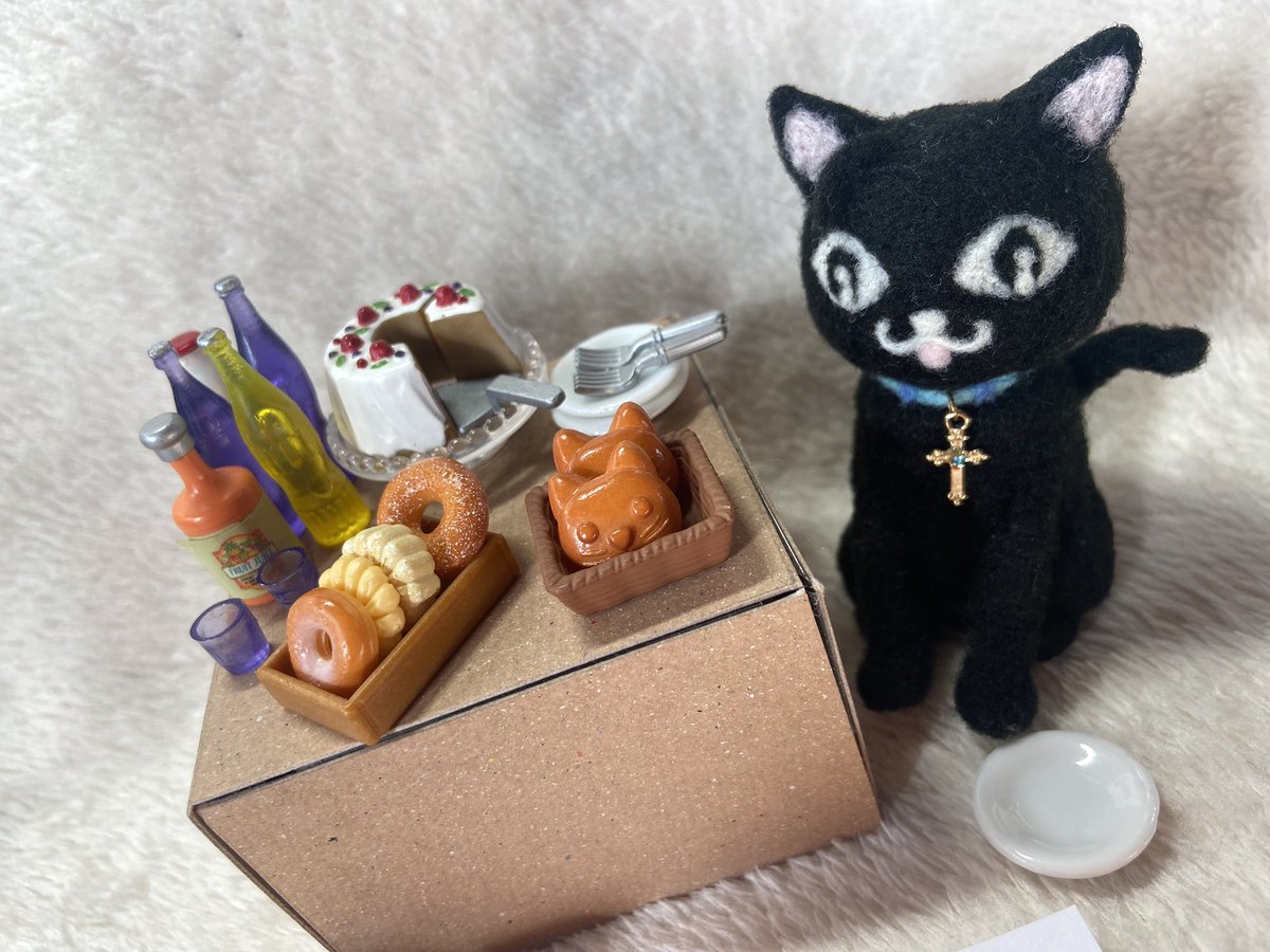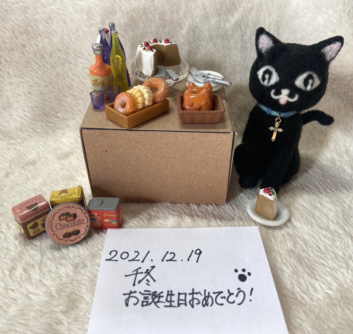 場地さんとペケJがお誕生日会の準備したみたいですよ〜! 千冬おめでとう〜🎂🎉 「ペケJ、ケーキつまみ食いしたのバレると思うかァ?」 「.....ニャン」 #松野千冬生誕祭2021 #松野千冬誕生日祭2021 #東卍FA #羊毛フェルト