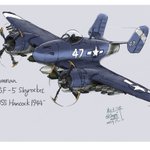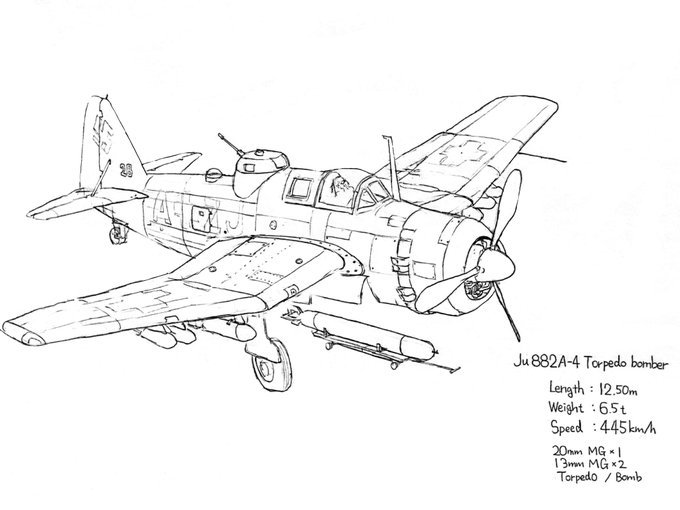 #架空機 #イラスト #KKv_Hapzye 名称 Lönna(ローナ) 種別 重爆撃機 設計 YavtWitt(ヤウトウィット) 旋回時間 ? 上昇速度 ? 離陸距離 820m 最高高度 8000m 最高速度 390km/h 航続距離 1750km 乗員 8~10名 主機 Deten MCMR1101 x 2 ,Deten MCMR1105 x 2 兵装 6410kgまで →
