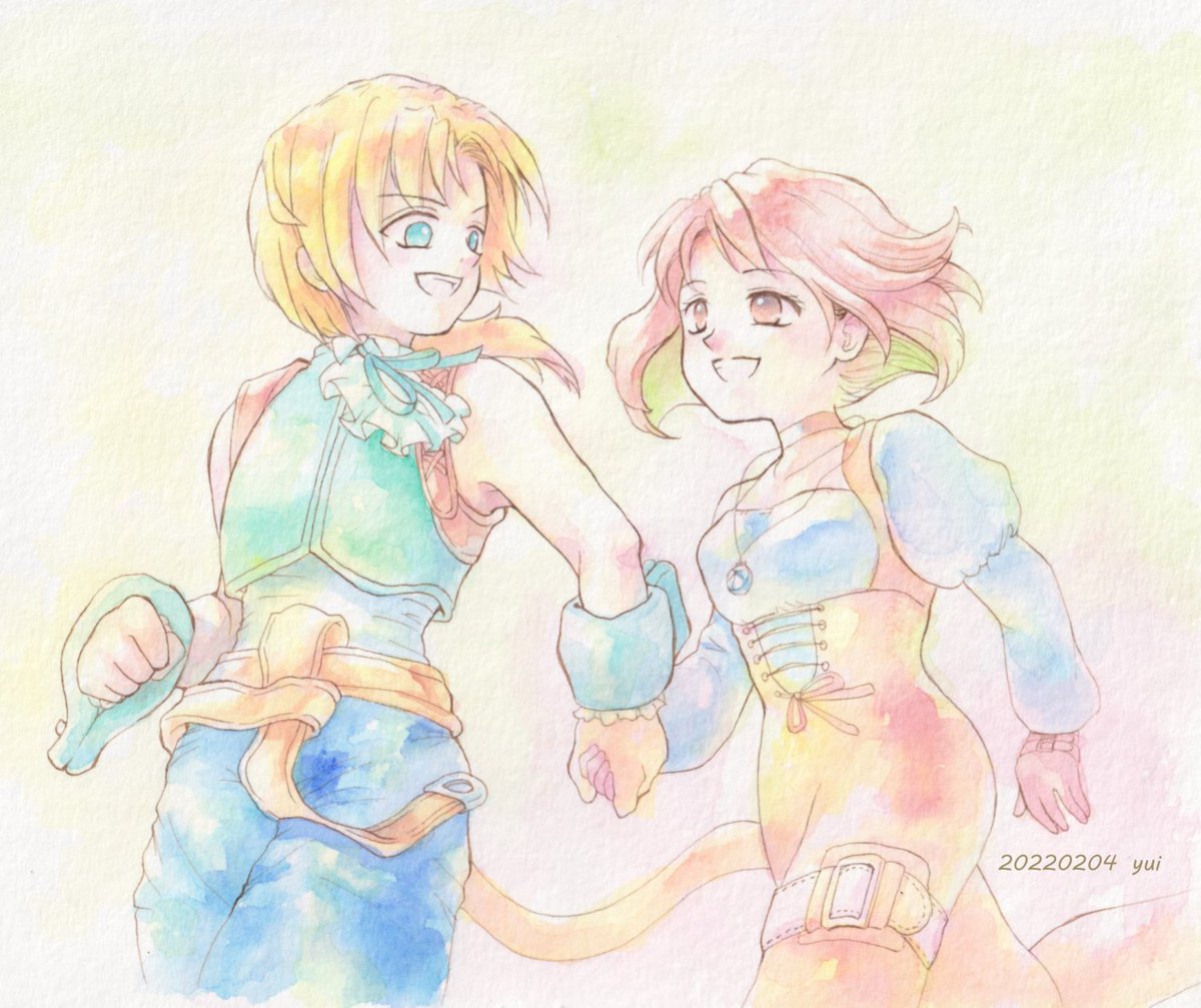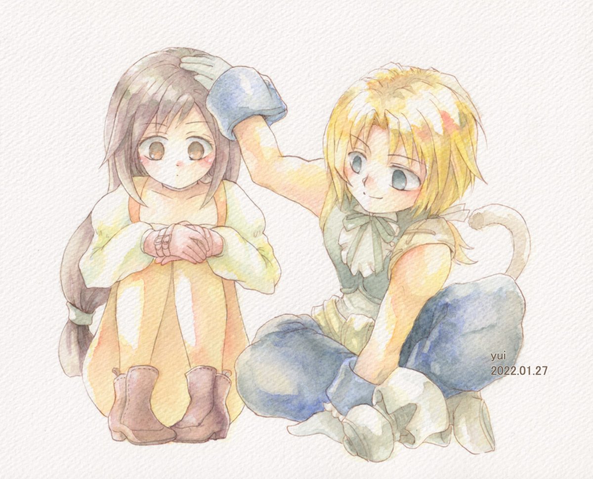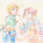 エアスケブ🎁かのさんへ! 頭ポンポンしてるジタンをリクエストいただきました。 最初のころの距離感で描いてみました。 肩をポンとするくらいの感覚のジタンと、時間差で「今のは何!?」となりそうな姫様を妄想しました😊 リクエストありがとうございました♪ #柘榴姫としっぽの盗賊