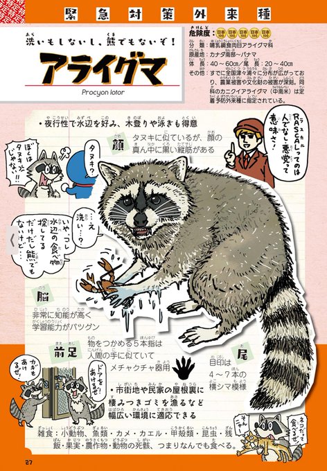 🦝アライグマのすき焼き🍲が出るらしいので、キュートな見た目とは裏腹に超凶暴。70年代のアニメ人気で持ち込まれ年間うん億の農業被害を出すアライグマの見分け方。ちなみにラスカル(Rascal)ってのは「人でなし・悪党」という意味です。 #外来いきもの図鑑 amzn.to/3VO30Re #格付けチェック