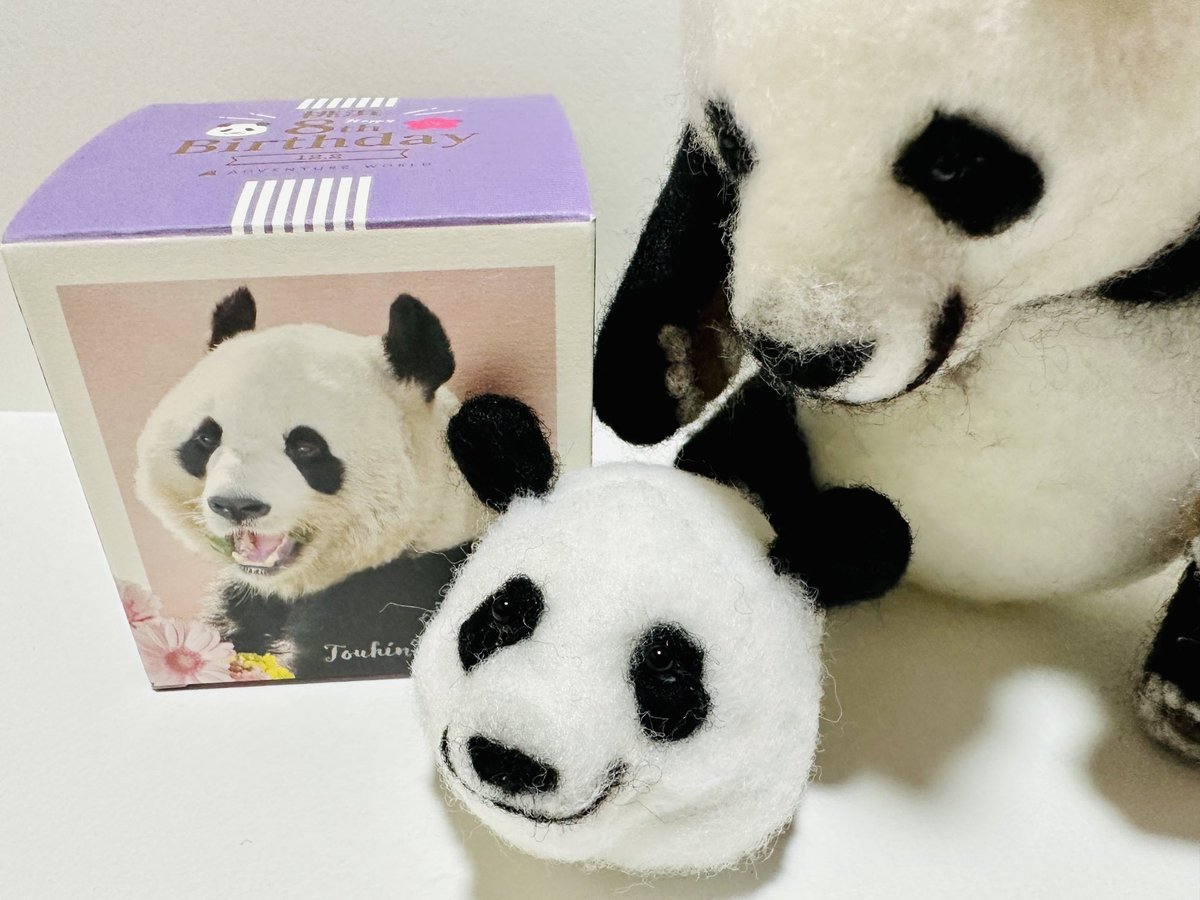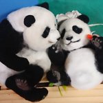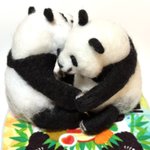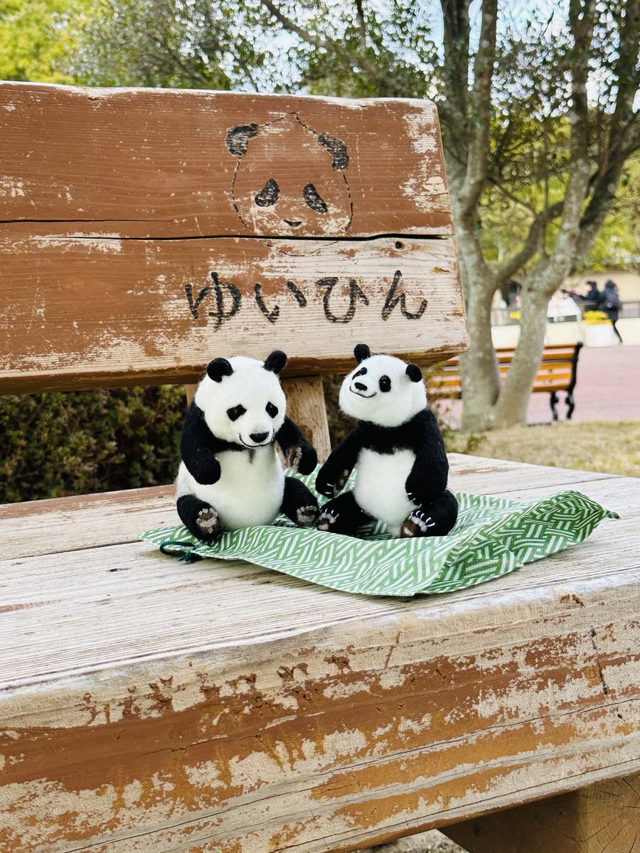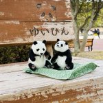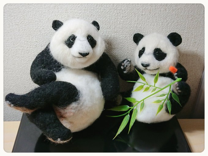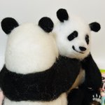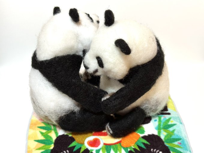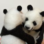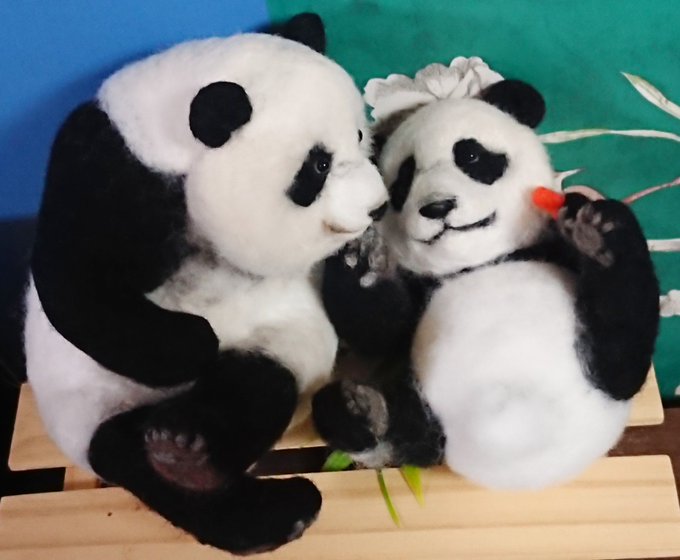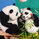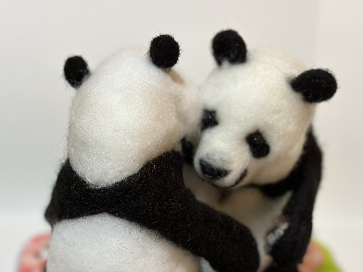 先程の桃浜と以前の楓浜を並べてみました!🍁『桃ねーたんカイカイなん?』🍑『めっちゃカイカイやねん💧楓ちゃんカキカキしてくれる?』🍁『うん!楓がカキカキする~』 #アドベンチャーワールド #楓浜 #桃浜 #浜家 #ジャイアントパンダ #羊毛フェルト