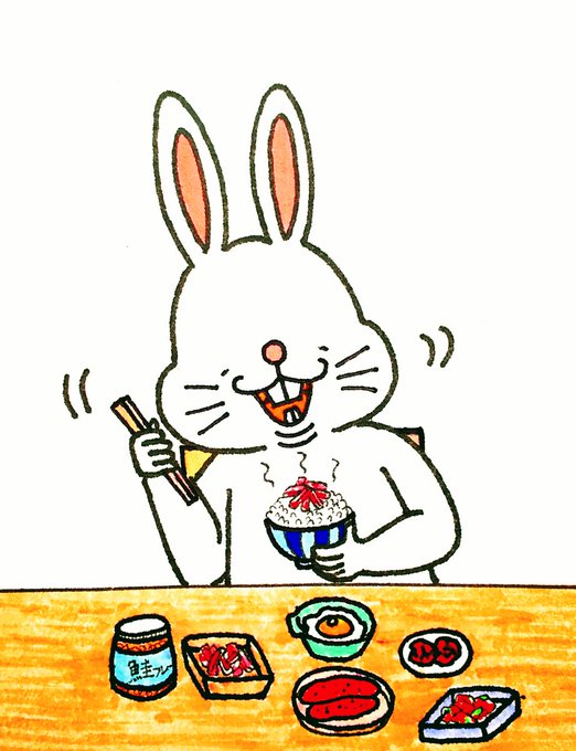 こんにちは!🍀👀 前歯うさぎさんです🐰🥕 【ご飯のおとも🎶 ~たまにはホッカホカご飯に塩辛!~】 #イラスト #前歯うさぎ #絵描きさんと繋がりたい #絵柄が好みって人にフォローされたい #illustration #design #art #rabbit #ご飯のおとも #塩辛 #キムチ #梅干し #明太子 #鮭フレークは殿堂入り