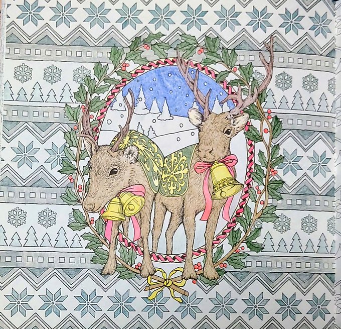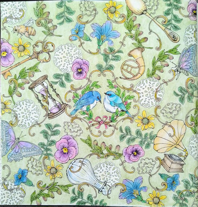 お気に入りのモスグリーンを背景に壁紙のような雰囲気にしたくて塗りました。実際はもっと渋い緑でもう少し濃い色です。写真を上手く取るのは難しいですね。 #色鉛筆 #大人の塗り絵 #森が奏でるラプソディー