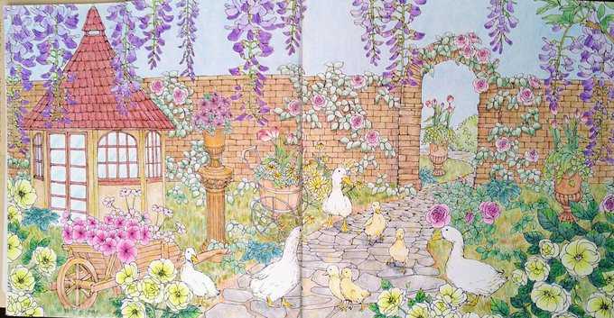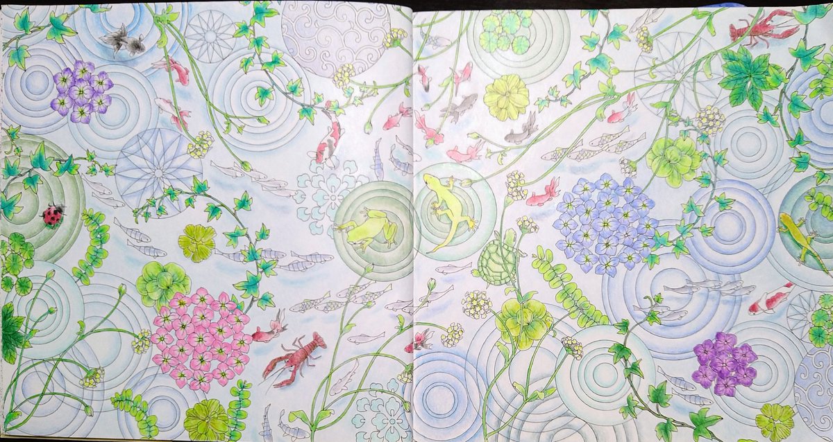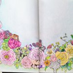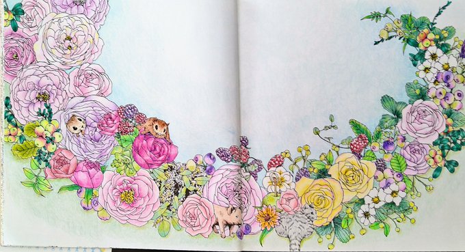 「初夏」のつもりで、ブルーベリーや他の実(名前がわからなかった…)もこれから色づく感じでぬりました。自分ではブルーベリーの色合いが気にいってます。 #大人の塗り絵 #色鉛筆 #森が奏でるラプソディー