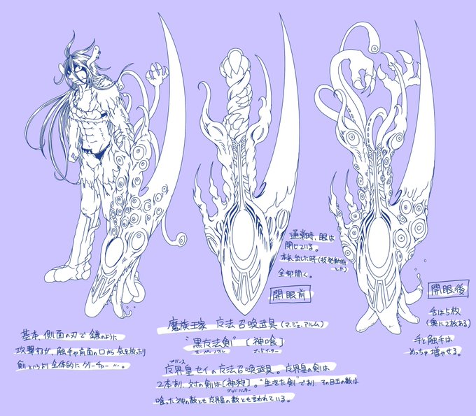 魔族王家魔法召喚武具(マ・ジェ・アルム) 【黒魔法剣】(エ・ペ・ノワル)【神喰】(ゴッドイーター)(長い) ⚠️多眼・集合体注意⚠️ やっと設定画出来た…(´Д` ) #絵描きさんと繋がりたい #ArtistOnTwitter #創作の狼煙 #アトリエの系譜S #イラスト #doodle #棺ノ王子