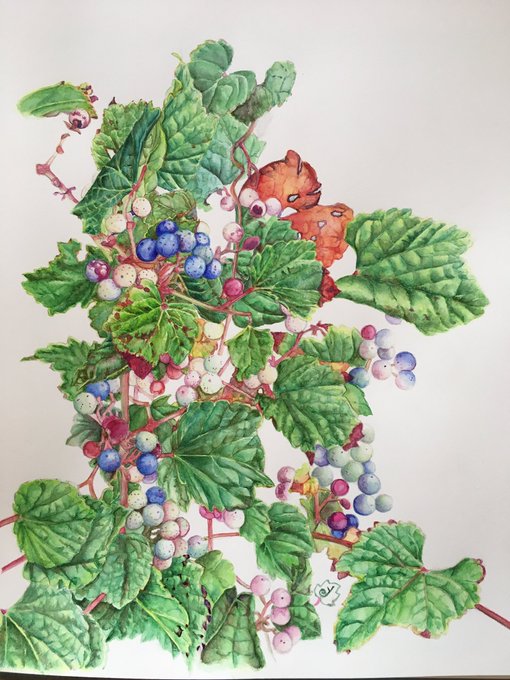 ノブドウ 学名: Ampelopsis glandulosa var. heterophylla porcelain berry 今年も描こうと思って実がなるのを待っていたら、全て鳥さんにうわ前をはねられました(泣) #絵描きさんと繫がりたい #イラスト好きさんと繋がりたい #植物好きな人と繋がりたい #水彩画