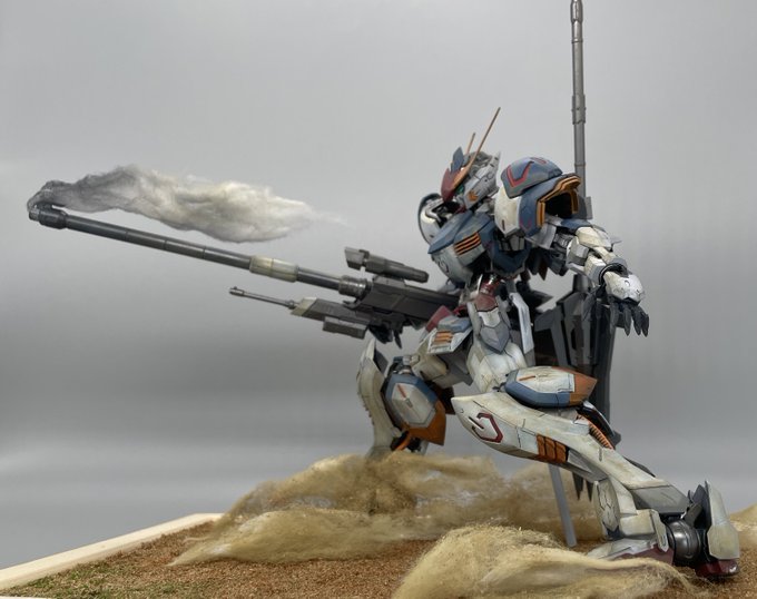 MG ガンダムバルバトスと ジオラマっぽいやつ完成です😆 滑腔砲をぶっぱなした直後を切りとった構図です( ˙灬˙ ) 僕自身初の試みなので、温かい目で見てやってください🤣 雰囲気だけでも伝われば幸いです*゚Д゚)ドキドキ #ガンプラ #模型サークルRemix #プラモデルを楽しんでおります