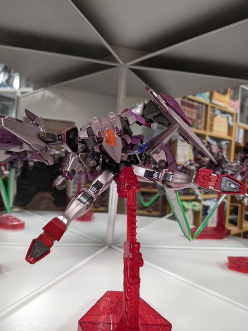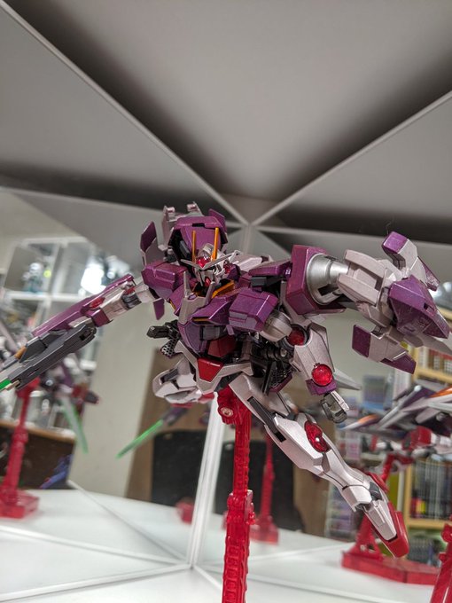 #ガンプラの画像貼るとRTされると聞いて #機動戦士ガンダムOO #ガンダムヴァーチェ ガンダムヴァーチェ(トランザムモード)グロスインジェクションバージョン 完成! 折角の特殊カラーなのでスミ入れを最低限に抑えトップコートで光沢処理を施してみました! ……写真だと光沢解りづらいですね(汗)