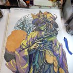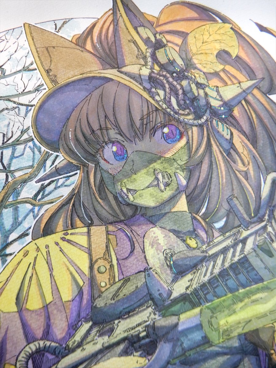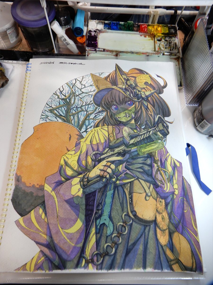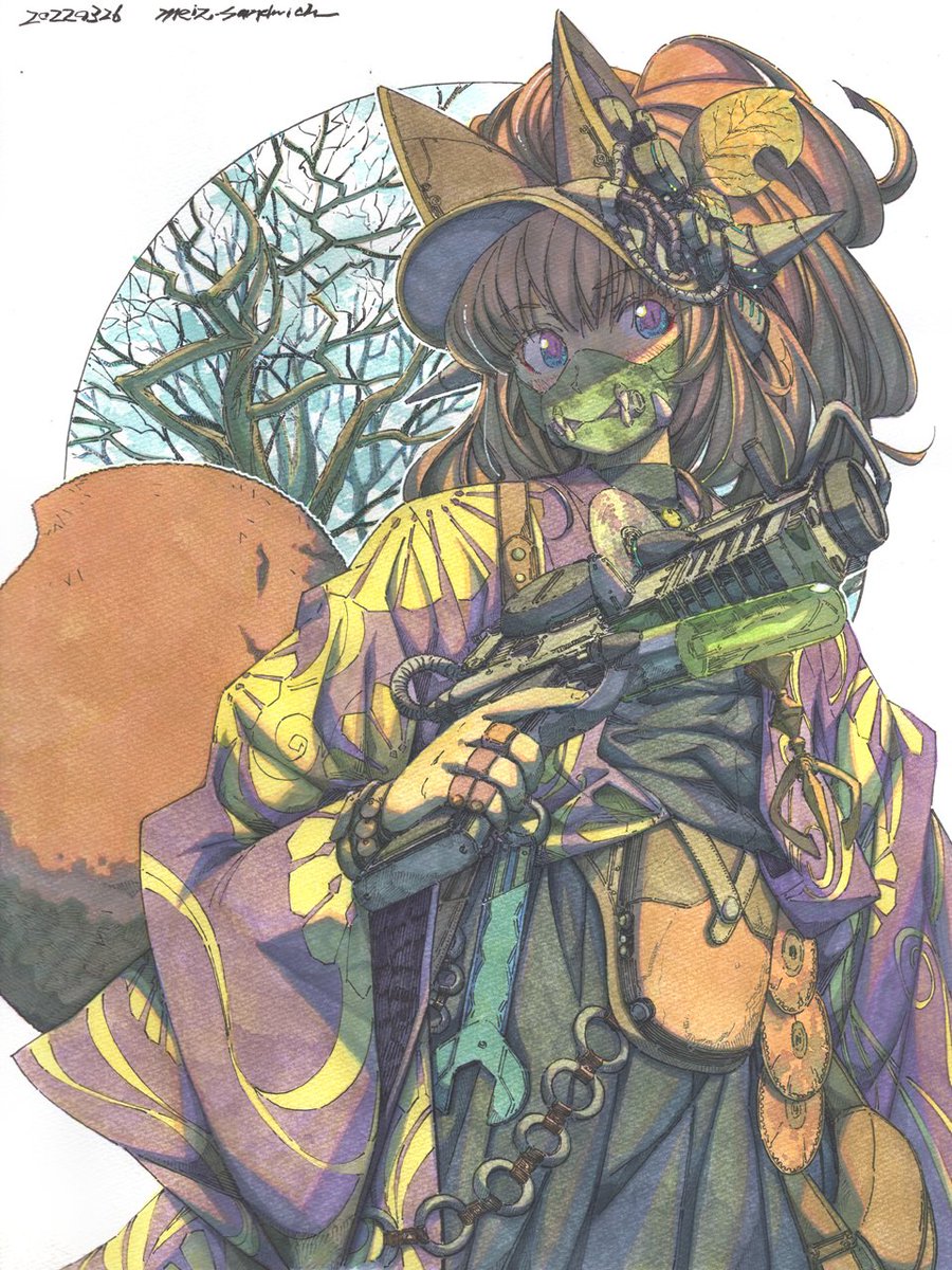 【アナログ1751:SOUNDGUN】パーカッショニスト&ガジェット・エンジニアのhandmanoさん(twitter.com/handmano)の衣裳を参考にした絵です。元写真(twitter.com/handmano/statu…) A3と大きく、ペンタッチも変えたりと、いつもと違うことの多い絵です。 #機械狐 #スチームパンク #狐娘 #水彩