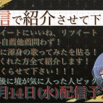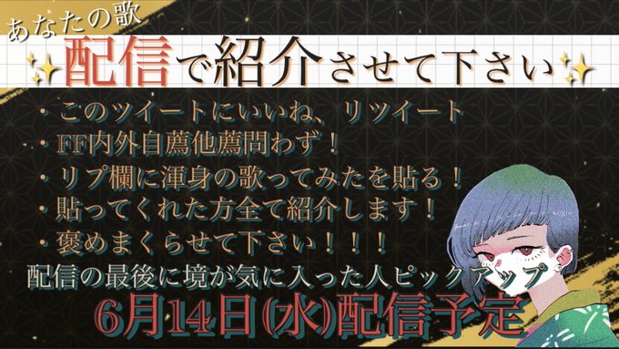 歌い手さま… ✨歌ってみた紹介させて下さい✨ ✨歌ってみた紹介させて下さい✨ ここをいいね、リツイートしてからリプ欄に歌ってみたを貼って下さい! 主の性質上、あなたの歌を褒めまくります。 #歌い手さんMIX師さん動画師さん絵師さんPさんと繋がりたい #歌い手さんと繋がりたい #歌い手