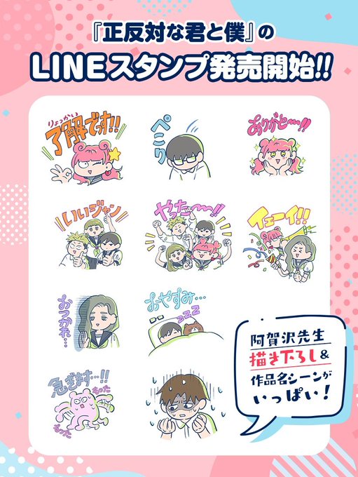 #正反対な君と僕 LINEスタンプ作成頂きました!🎊 書き下ろし+作中シーンの切り抜き の計40個です╭( ・ᴗ・ )و✨ 是非〜〜! 正反対な君と僕(阿賀沢紅茶) - LINE スタンプ | LINE STORE store.line.me/stickershop/pr…
